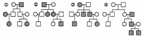 28.以下家系图中属于常染色体隐性、Y染色体、X染色体显性、X染色体隐性遗传的依次是