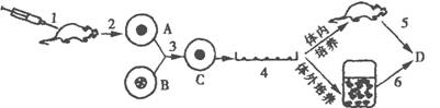 (4)若该过程是制备单克隆抗体,A为小鼠效应B细胞,那么,在获得此细胞之前,小鼠已经被注射了 。注射后小鼠身体发生了相应的免疫反应,生成了 _______
