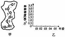 3. (9分)豚草是原产自北美的植物,其花粉是北京地区主要的过敏原。下图甲示我国北安河地区路旁的一片闲散地,课外小组的同学对此地部分植物的种群密度连续进行了五年的调查,结果如表所示(单位:株/m2)。