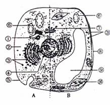 (5)若B是植物的根毛细胞,则图中不应有的结构是[ ] ,若B是叶片细胞则应具有此细胞器,此细胞器中完成的植物细胞重要生命活动是 ,其过程可分为两个阶段: 和 。