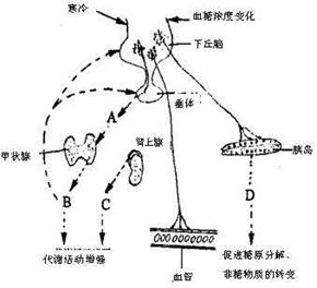 (10分)下图表示人体血糖浓度发生变化和人体受寒冷刺激后的部分调节过程示意图(A、B、C、D表示激素),分析回答: