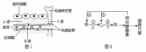 26.(6分)图Ⅰ是某组织局部结构模式图。图Ⅱ是人体甲状腺激素分泌的分级调节示意图,甲、乙、丙分别代表腺体名称, X、Y代表激素名称。请据图回答: