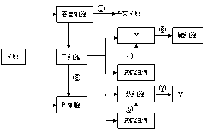 (8分)下图为人体免疫部分过程示意图。请据图回答: