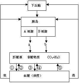 (6分)右图为人体内血糖的调节示意图,序号表示生理过程,字母a、b表示两种与血糖调节有关的激素。请据图作答: