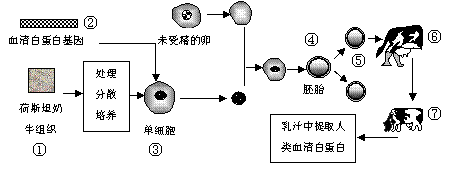 44.(12分)随着科学技术的发展,人们可以根据人类的需求来改造生物的性状,在许多领域取得了可喜的成果,下图是利用奶牛乳汁生产人类血清白蛋白的图解,根据下图回答: