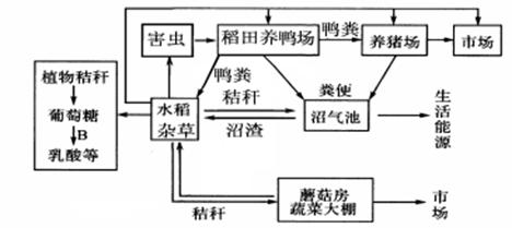 33.(10分)下图是我国南方开始尝试的农业生态系统的结构模式图,它利用雏鸭旺盛的杂食性,吃掉稻田里的杂草和害虫,利用鸭不间断的活动产生中耕浑水效果,刺激水稻生长,用作物养猪、养鸭,用稻秆培育蘑菇、生产沼气,猪鸭粪、沼渣肥田,生产出无公害的大米与蛋肉类。请据图回答: