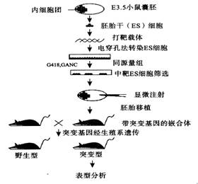 4、美英两国的两位科学家因为在胚胎干细胞研究方面的“基因靶向”技术获得2007年度诺贝尔生理学或医学奖。通过“基因靶向”技术可以对小鼠染色体组进行特异性的遗传修饰,包括简单的“基因敲除”、点突变的引入、染色体组大片段的删除和重排以及外源基因的定位整合等。下图是“基因靶向”技术的主要步骤,请据图回答下列问题: