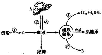 (1)当体内G过多时 分泌增强,使G进入A合成 ,进入 合成肌糖元,进入组织细胞进行[④] 和[⑤] 。同时还抑制[②] 和 。