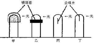 3.下图所示是对燕麦胚芽鞘进行的向光性实验,(图中锡箔套不透光,云母片不透水,箭头表示单侧光照)。图中能弯向光源生长的是 ( )