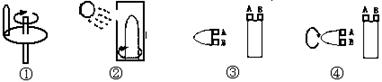 15.对胚芽鞘进行如下图的①-④的实验,其中旋转均为匀速慢速旋转,一段时间后停止旋转时,实验①、②装置仍停止在如图位置,则四个胚芽鞘的生长方向依次是 ( )