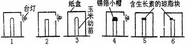 (一)方法步骤 取6个小花盆,各栽入一株品种、粗细和大小都相同的玉米幼苗(要求幼苗的真叶未突破胚芽鞘)。按下图所示方法进行实验处理。接通台灯电源24h后,打开纸盒,观察并记6株玉米幼苗的生长情况。