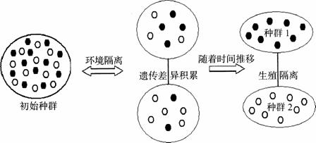 C.初始种群→环境隔离→遗传差异不断积累→随着时间的推移→自然选择→新物种形成