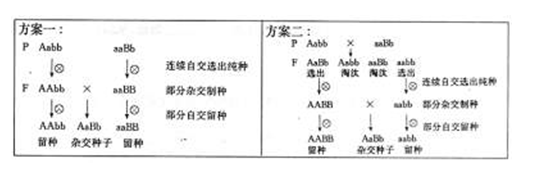 (2)方案一中Aabb连续自交3代,纯合子所占的比例是 ,方案二中AaBb个体自交后代中出现AABB的概率是 。