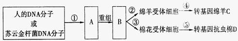 (1)在基因工程中,A表示 ,如果直接从苏云金杆菌中获得抗虫基因, ①过程使用的酶区别于其他酶的特点是 (2分),B表示 。