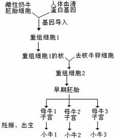 材料一:人的血清蛋白在临床上需求量很大,通常从血中提取。由于艾滋病等人类传染病造成的威胁与日俱增,使人们对血液制品心存疑虑。生物技术的发展与应用使利用动物生产人的血清蛋白成为可能,如下图是上海某研究所培育生产出血清蛋白奶牛的流程。请据图回答:(4分)