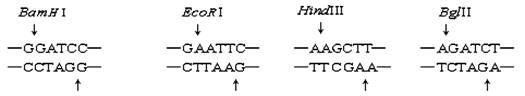 限制酶是一种核酸切割酶,可识别并切割DNA分子上特定的脱氧核苷酸碱基序列。下图为四种限制酶BamHI,EcoRI,HindⅢ以及BglⅡ的辨识序列。箭头表示每一种限制酶的特定切割部位,其中哪两种限制酶所切割出来的DNA片段末端可以互补黏合?