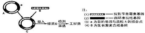 下图是将人的生长激素基因导入不含质粒A且无相应的基因的细菌D细胞内,产生“工程菌”的示意图。所用的载体为质粒A。若质粒A导入细菌后,其上的基因能得到表达。则表明目的基因已与运载体结合,并被导入受体细胞的结果是