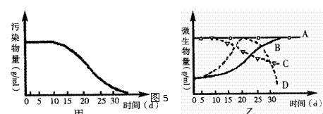 图5-甲为某清洁水体在遭受一次性有机物轻度污染后,污染物含量的变化。则水体中好氧性微生物数量变化的曲线最可能接近于图5-乙中的( ) ( )