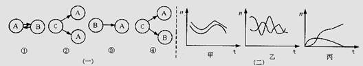 50.下图(一)中所示的生物间关系,A、B代表两种生物,C代表生物的生活条件,箭头表示营养流动的方向;图(二)在坐标系中表示两种生物之间的关系。下列图(一)(二)中所表示的生物关系配对正确的一组是 ( )