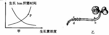 将植物横放,测量根和茎生长素浓度与其生长状况的关系如甲图所示。则曲线上P点最可能对应于乙图中的位置是( )