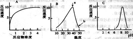 13.下列A、B、C三图依次表示酶浓度一定时,反应速度和反应物浓度、温度、pH值的关系。请据图回答下列问题:(每空1分,共6分)