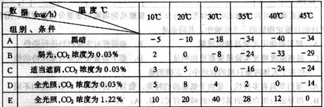 14.某生物兴趣小组开展多种环境因素对植物光合作用影响的探究活动。下表为实验测得的数据,其中A组为黑暗条件下马铃薯呼吸速率随温度变化的数据,B、C、D、E为不同光照强度和不同CO2浓度下,马铃薯吸收(+)或释放(一)速率(mg/h)随温度变化的数据。请分析回答:(共9分)