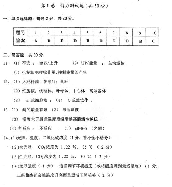 12.调节电子显微镜,观察样品A、B、C细胞结构。观察到a-e各具有下列特征:a、b、c均由双层膜构成,其中a的膜上有小孔,而b、c没有。细胞分裂时,从d发出星射线,e与蛋白质进一步修饰和加工有关。将关于样品A、B、C的细胞结构的有无作表如下: (每