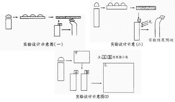 ⑷如果实验设计(三)是为了研究单侧光引起胚芽鞘尖端生长素分布不均匀,请将实验设计示意图(三)中的甲、乙两图画图补充完整。