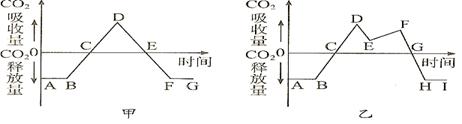 44.下图中的甲、乙两图为一昼夜中某作物植株对CO2的吸收和释放状况的示意图。甲图是春季的某一晴天,乙图是在盛夏的某一晴天,请据图回答问题