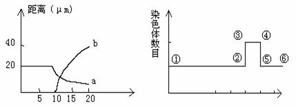 下图表示有丝分裂过程中染色体的运动,其中纵坐标表示距离(μm),横坐标表示时间(分)。图A中曲线a表示染色体着丝点与纺锤丝相应极之间的平均距离;图B①~⑥表示有丝分裂染色体数目变化曲线,分析回答: