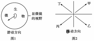 49.使用普通光学显微镜观察水中微生物,若发现视野中微生物如图1所示方向游走,请问应该把载玻片向图2所示的哪个方向移动?