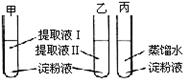 44.将小麦种子分别置于20℃和30℃培养箱中培养4天,依次取等量的萌发种子分别制成提取液Ⅰ和提取液Ⅱ。取3支试管甲、乙、丙,分别加入等量的淀粉液,然后按下图加入等量的提取液和蒸馏水,45℃水浴保温5分钟,立即在3支试管中加入等量本尼迪特试剂并煮沸2分钟,摇匀观察试管中的颜色。结果是 ( )