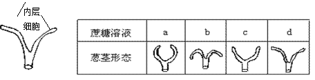 取一段长5 cm的葱茎,将其纵切至4 cm处。由于纵切的葱茎使薄壁的内层细胞摆脱了厚壁的表皮细胞的束缚,其中内层细胞比外层表皮细胞扩张能力强,扩张速度更快,从而使葱茎向表皮外弯曲,切后的形状如下图,将它作为对照。再取另外四节葱茎做同样的处理,将它们分别置于a至d的不同浓度的蔗糖溶液中,30分钟后,葱茎形状记录如下。据此判断蔗糖溶液浓度的大小为( )