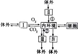 下图示人体细胞与外界环境之间进行物质交换的过程,Ⅰ、Ⅱ、Ⅲ、Ⅳ表示能直接与内环境进行物质交换的四种器官,①②是有关的生理过程,下列说法错误的是
