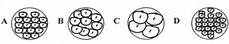 16、若用同一显微镜观察同一标本4次,每次仅调整目镜或物镜和细准焦螺旋,结果得到下面各图。试问其中视野最暗的是( )