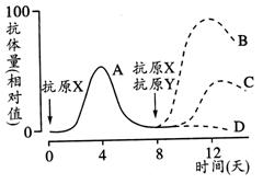 (2)右图表示将抗原注射兔体内后抗体产生量的变化。当注入抗原X,抗体产生量的变化是曲线A。若第8天,同时注射抗原Y和X,图中表示对抗原X的抗体产生量是曲线_______;这是因为初次免疫反应时产生的___________细胞的作用。