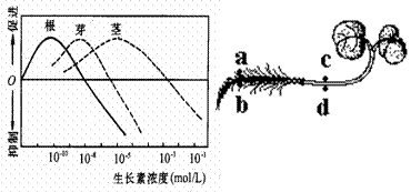 (2)分析图所示的植物生长现象,比较a、b两处,生长素浓度比较低的是 ,比较c、d两处,细胞生长较慢的是 。