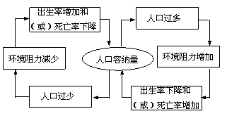 人口的数量常常随环境资源的改变而发生波动。下图为人口自动调控图(注:环境中的人口容纳量是指环境资源能承载的最大人口数量)。请据图回答下列问题: