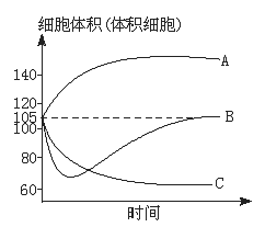 (1)在A、B、C中,细胞在蒸馏水中的是_____________,在蔗糖溶液中的是_____________,在尿素溶液中的是_____________。