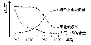 ②由于SO2浓度降低,树干上地衣数量增多。原因是地衣对SO2敏感,因此SO2浓度降低,有利于地衣的生长。