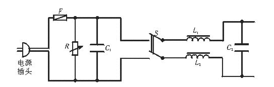 22.在彩色电视机的电源输入端装有电源滤波器,其电路图如下图所示。主要元件是两个电感线圈L1、L2,它们的自感系数很大,F是保险丝,R是灵敏电阻(正常情况下阻值很大,但电压超过设定值时,阻值会迅速变小,可以保护与其并联的元件),C1、C2是电容器,S为电视机开关。某一次用户没有先关电视(即没断开S)就拔掉电源插头,结果烧坏了图中电路元件,可能被烧坏的元件是: