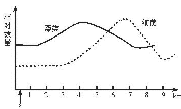 在x位置下游,藻类大量增加的原因是________________________,在下游3~6 km河段细菌数量迅速增加的原因是_____________________________________。