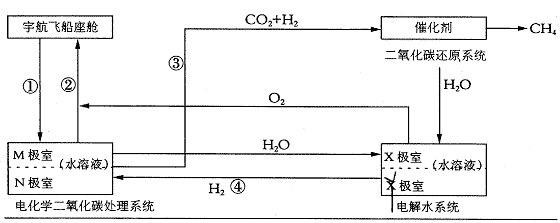 (1)管道①把飞船座舱中含较多二氧化碳的潮湿空气通入“电化学二氧化碳处理系统”的N极室,通过该电极反应可以使二氧化碳不断被吸收;该电极反应式为___________________,其电解产物吸收二氧化碳的离子方程式为____________________。在N极吸收二氧化碳后形成的离子会通过隔膜进入M极室,通过M极的电极反应可使二氧化碳从电解液中释放出来,并保持系统内的pH不变;该电极反应式为____________________________,二氧化碳逸出的离子方程式为____________________________。