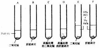 33.二氧化锰是一种无机催化剂,它可以使过氧化氢分解成水和氧,新鲜的肝脏中含有过氧化氢酶,这种酶也能使过氧化氢分解成水和氧。为了验证无机催化剂与酶的区别,做了以下实验;取六只试管从A-F标好号,每一只试管内注入过氧化氢的体积数为3%的溶液各5ml,其余的方法如下图处理: