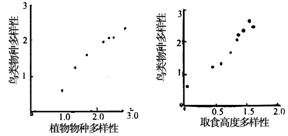 (4)研究鸟类多样性与植物物种多样性和取食高度多样性的关系如下图,(取食高度多样性是对植物垂直分布中分层和均匀性的测度。层次多,各层次具更茂密的枝叶表示取食高度多样性高。)分析该图可得出哪些结论: