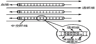 氨对细胞有毒,必须迅速排出。若人体双侧肾脏衰竭,导致代谢废物不能及时排出,从而危及生命。治疗方法之一是血液透析。过程如下图所示: