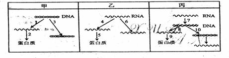 35.(6分)已知甲、乙、丙三种类型的病毒(致癌病毒、噬菌体、烟草花叶病毒),它们的遗传信息的传递方式分别用下图表示。请对图仔细分析后回答: