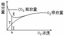 下图表示的是某植物的非绿色器官呼吸时O2的吸收量和CO2的释放量之间的相互关系,其中线段XY=YZ。则在氧浓度为a时有氧呼吸与无氧呼吸
