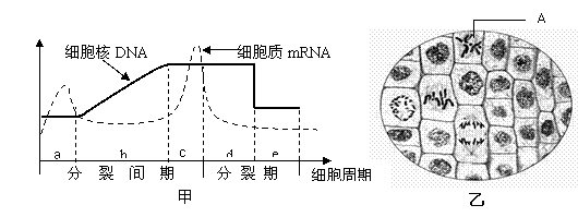 5 (4分)通过实验研究洋葱根尖细胞有丝分裂过程,得出下图所示的结果,其中图甲表示有丝分裂各阶段细胞核中DNA和细胞质中信使RNA含量的变化,图乙是有丝分裂显微照片。据图回答下列问题: