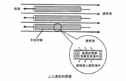 2. 人工肾能部分代替真正的肾起作用。如下图所示,患者的血液在中空的纤维中向一侧流动,称为透析液的水溶液在中空的纤维外侧向相反的方向流动。血液中的水分子、废物等通过血液透析膜(中空纤维壁)进入到透析液中,请分析: